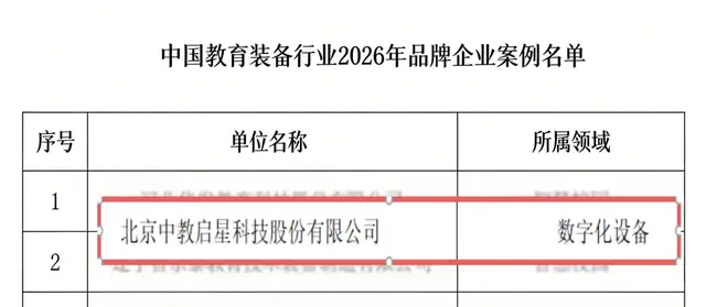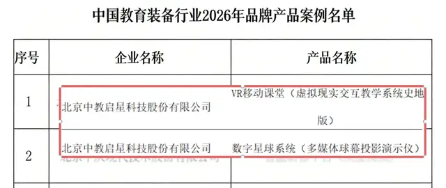 1、北京中教启星科技股份有限公司入选中国教育装备行业2026年品牌企业案例名单。