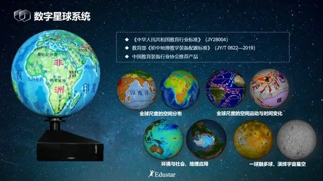 中教启星数字星球系统是国内率先实现三维立体动态展示的单体数字化教学仪器,是中小学地理等学科核心教学装备。其核心是依托三维图像处理平台与精密光学技术,将图片、视频等多媒体学科资源转为球面影像,动态立体呈现地球运动、板块漂移、宇宙演化等抽象现象,适配学科教学与科普场景。本系统已纳入教育部行业标准(JY28004)与中学地理教室装备规范,被多省市列入装备目录,是推动教学数字化与学生空间思维培养的关键装备。